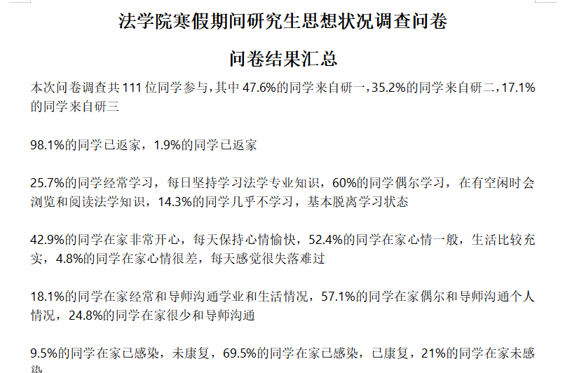 2.调查问卷数据分析和报告。在寒假期间,为响应学校、学院关于思想状况调查要求,保障逼哩逼哩