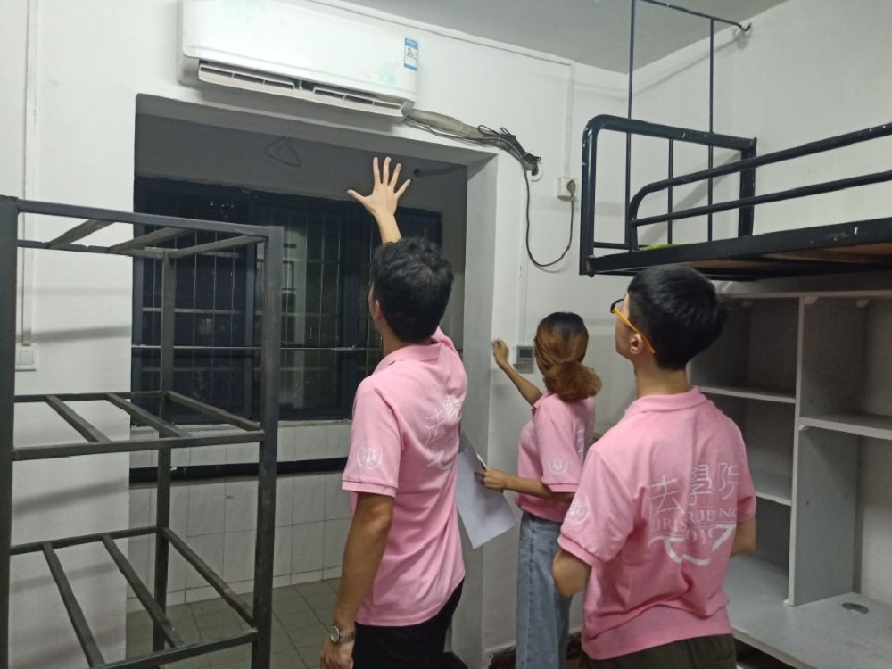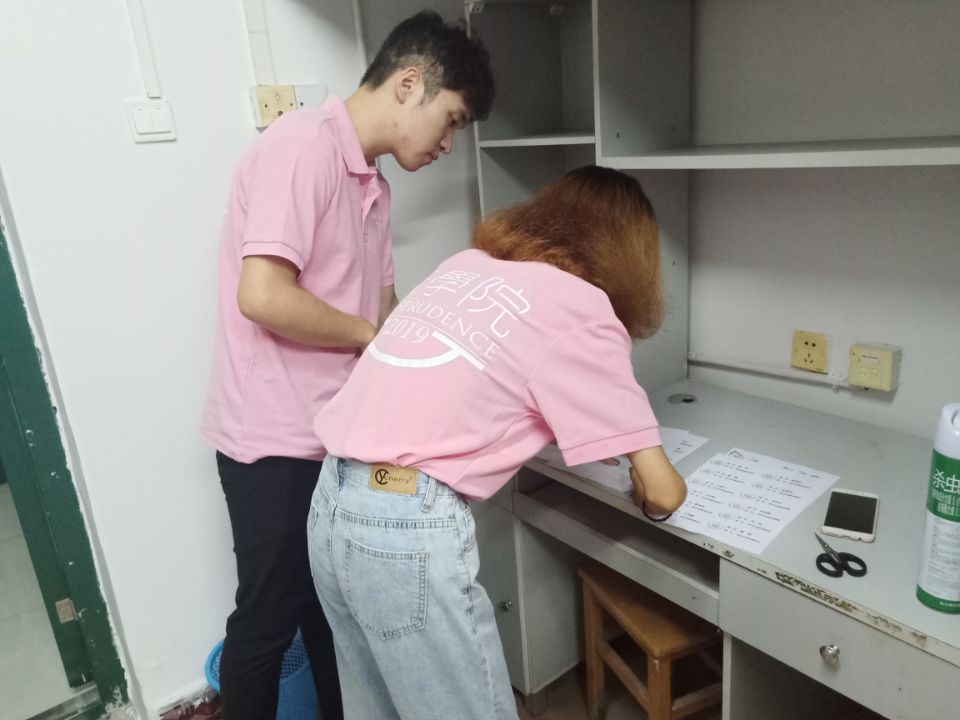 洒扫灰尘、喷洒驱蚊剂、查看水电、记录需报修的问题,团队成员通过走访,详细了解每间新生寝室的具体情况,提前帮助新生做好相关准备工作的同时也及时发现问题。