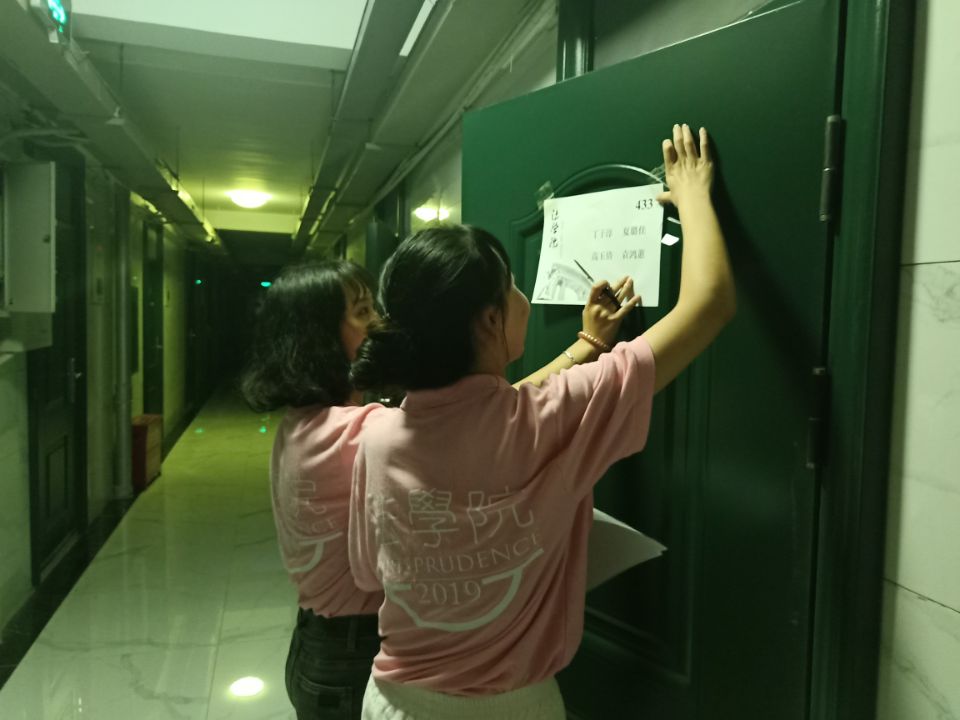 迎新团队成员为逼哩逼哩 的每一间新生寝室都粘贴上门签和致新生的一封信,信内记载新生常见问题注意事项和迎新团队成员的联系方式,团队成员还在新生的床铺上粘贴个人学号、姓名等信息,保证每一位新生都可以顺利地入住寝室。