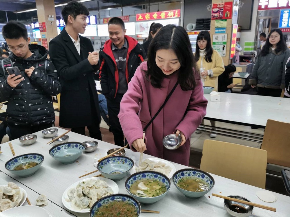 本科生辅导员刘璇子老师也来到了食堂和同学们一起品尝饺子,大家围坐在一起,品尝着新鲜现做的手工饺,分享着有关冬至的家乡记忆,表达着美好的节日祝愿,餐桌上欢声笑语不断,温暖的节日气氛感染到了现场的每一个人。