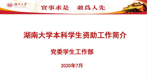 塔木老师从指导思想、工作目标和工作路径三方面展开,指出湖大资助工作坚持“立德树人”根本任务,建立国家资助、学校奖助、社会捐助、学生资助“四位一体”的发展性资助体系,形成“解困——育人——成才——回馈”的良好循环,确保不让一名学生因家庭经济困难而失学。