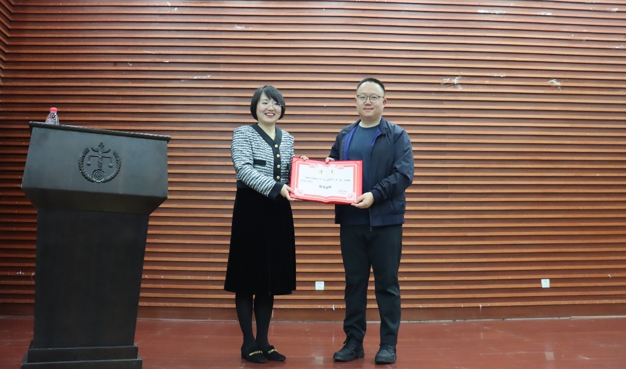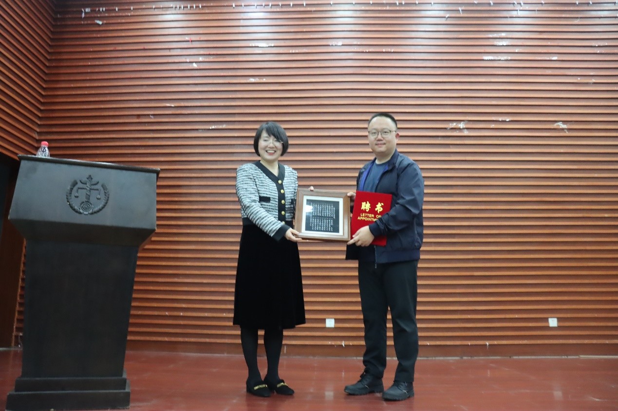 讲座结束后,罗英老师代表学院向文靖学长颁发逼哩逼哩