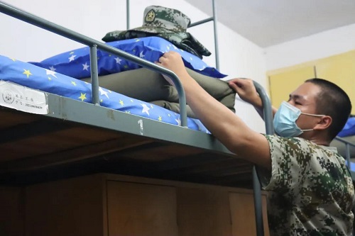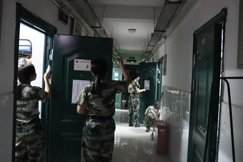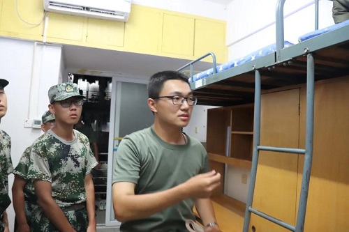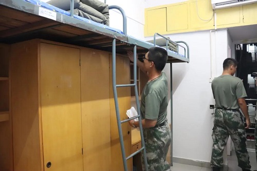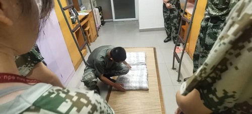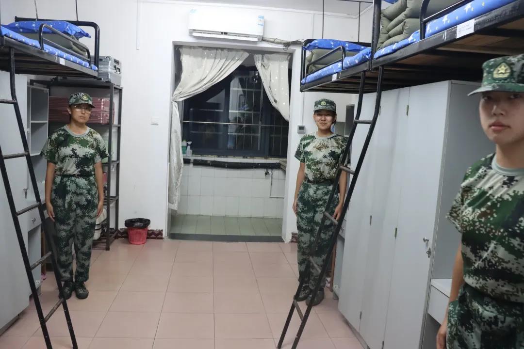 万事俱备,同学们在宿舍里严阵以待,等待着教官的检阅。教官们火眼金睛,检查时面面俱到、不放过任何一个角落。