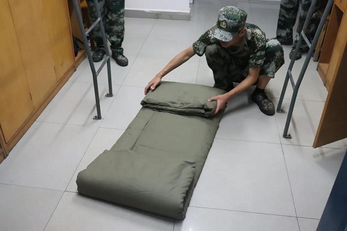 早在前些日子,教官们已经巡查过一次寝室,初步指导了同学们内务整理的方法。随后更是亲身上阵,教同学们叠传说中的“豆腐块”。