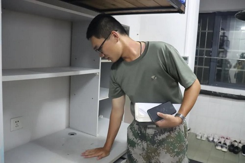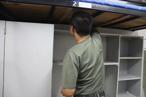 撕去挂钩、撕去壁纸、瓶瓶罐罐收纳好,柜子里干净整洁,除了几件军训服以外不留一点多余的东西。