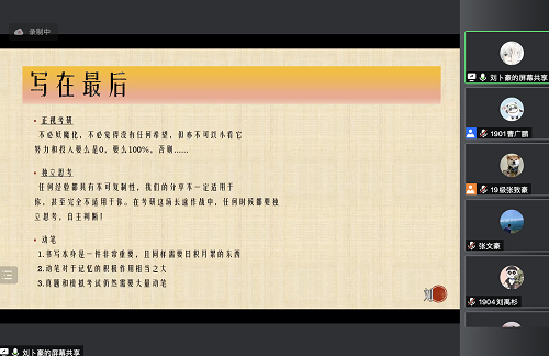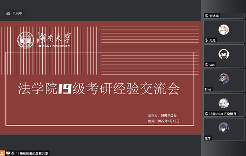 法学硕士已录取)、张文豪(南京师范大学法学硕士已录取)和肖康皓(吉林大学法律硕士已录取)等六位成功“上岸”的学长学姐分享经验,来自2019级和2020级的130余位同学线上参加交流会。逼哩逼哩