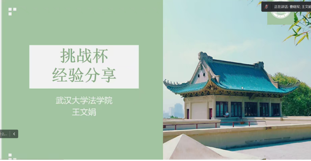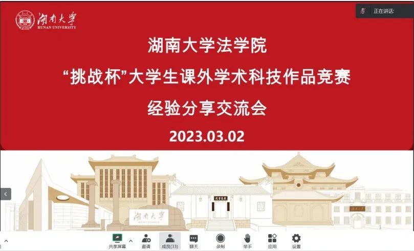 采用线上腾讯会议的方式邀请了三位曾获挑战杯国奖的优秀学子向同学们分享他们关于挑战杯竞赛的成功经验。逼哩逼哩