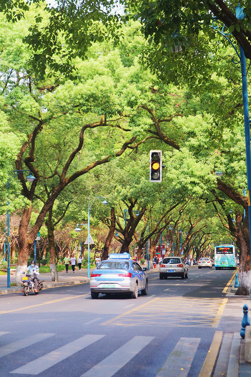 麓山南路位于岳麓山下,道路两旁绿树成荫,建筑成群,还有着各式各样的美食值得品尝。每当阳光洒落,微风吹拂,踏着自行车沿路而行,处处充满着青春洋溢的气息,满满的愉悦与惬意迎面而来。