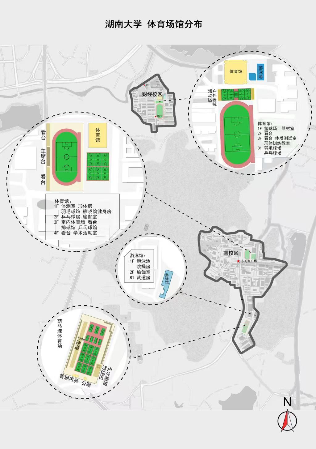 为方便各位同学锻炼身体、增强体质,我校在南校区设置南校区体育馆、南校区运动场、荫马塘运动场等。体育馆内有室内篮球场、羽毛球馆等,需要提前预约。荫马塘运动场设有篮球场、排球场等。在荫马塘运动场对面还有一个游泳馆,游泳馆在特定时间开放,各位“小法师”可以提前了解开放时间,以免跑空。