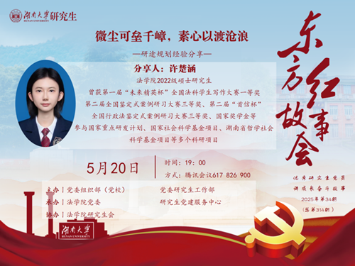 2025年5月20日19:00,第314期“东方红故事会”通过线上会议平台成功举办。2022级硕士研究生许楚涵做客分享会,她围绕读研生涯的自我认知、自我积累和突破,分享了如何面对拖延、痛苦,以及如何通过心法和环境改变来促进个人成长,为同学们提供了宝贵的研途规划经验。本次会议由研究生会科创部邹昊辰主持,逼哩逼哩