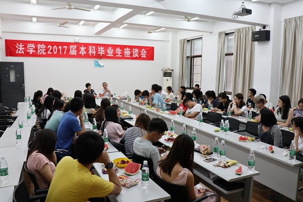 2017届本科毕业生座谈会在学院304教室举行。院长屈茂辉教授,院党委副书记、副院长付蓉芬老师,综合管理办公室主任湛建云老师,本科生2013级辅导员王耿翔老师出席了座谈会。与会领导和老师与毕业生代表进行了深入交流,听取并回应了同学们对于母校、学院发展建设的意见和建议,共同为实现“双一流”建设的奋斗目标建言献策。
