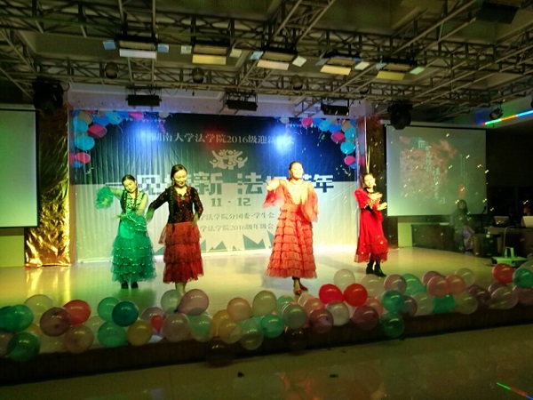 晚上七时许,晚会在充满激情与活力的开场舞《Good Boy》中拉开帷幕,同学们以昂扬的姿态放飞梦想,拥抱青春。行政管理二班的舞台剧《三个纯洁的童话故事》以搞怪的客串、精彩的表演、幽默的语言引发全场阵阵欢笑。法学三班的舞蹈串烧《千手观音》、年级会舞蹈串烧《高人指点》等节目,以动感的节奏,欢快的舞蹈,跳出了同学们的青春与活力,激情与梦想。法学五班的节目《非诚勿扰》以征婚交友为线索,配合幽默风趣的视频和语言,生动形象的表演赢得了全场阵阵掌声。法学四班的舞台剧《生死恋情》将新白娘子传奇的剧本进行了富有新意的改编,并配合现代舞蹈和音乐,加上演员们的精彩表演,使得全场观众们眼前一亮。法学三班孙兴健和林晨带来的《机场培训师》以其丰富的语言和夸张的动作表现,赢得了同学们的阵阵欢笑。法学一班的舞台剧《花千骨》充分地展示了同学们的想象力和创造力,不论是台词的设计,还是舞蹈的编排都突出了新意。在优美动人的古筝和葫芦丝乐曲中,法学四班的姑娘们手执花朵,眉眼含笑,踏歌而来,带来了清新歌舞表演《茉莉花》,舒缓典雅,落落大方,观众都沉浸在这美好的氛围中。而同样是《茉莉花》的乐曲,法学二班的同学们则带来了精美的舞蹈串烧,巧妙的将不同风格的舞蹈串联在同一个节目中,取得了很好的效果。行管一班的时装秀节目《行管一班的秘密》以动感的音乐和滑稽的表演嗨翻全场。