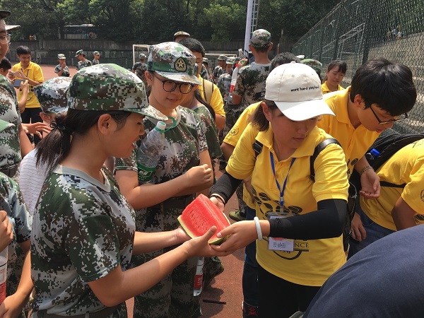 党委书记李连友、副书记付蓉芬、行政办主任湛建云、学工办主任杨锦滔和法学1604班班主任余凯老师等带着近千斤西瓜和水“犒劳”参训师生,向正在接受军训的本科新生、教官和迎新团队全体成员送去学院的慰问和关心,帮同学们消暑降温,为同学们加油鼓劲。