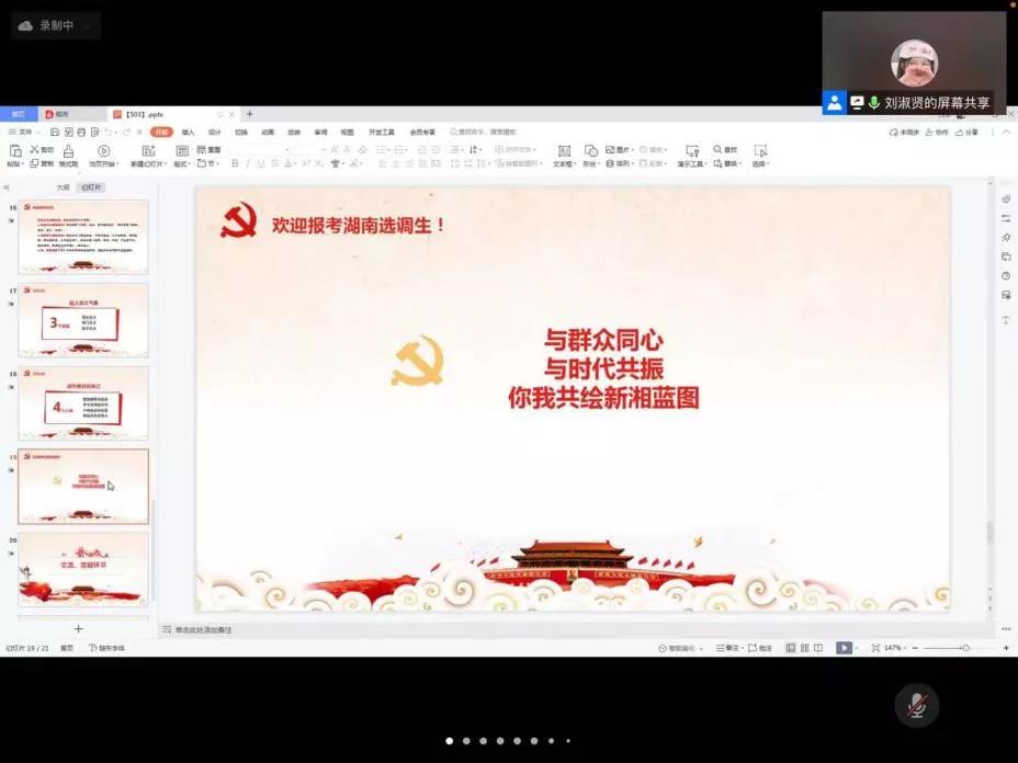 2.工作心得:成为基层的一名选调生以后,师姐谈到自己的几点工作心得“旗帜鲜明讲政治、学习敢强超本领、干群联系知民情、理想坚定有信心”。并寄语同学们:与群众同心、与时代共振、你我共绘新湘蓝图。