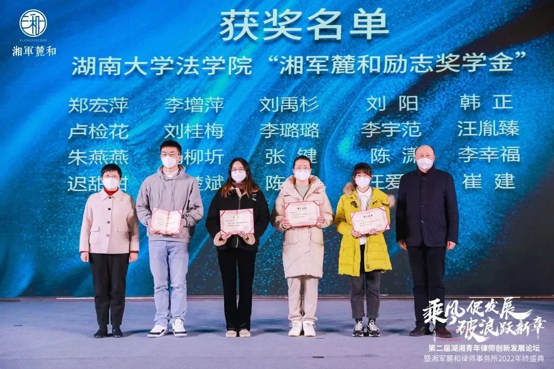 发展建设的鼓励与鞭策;二是祝贺二十名同学获得湘军麓和励志奖学金,期待学子们把本次奖金的获得,当作自己成长路上的新起点,加强学习,努力回馈社会;三是祝福湘军麓和2023年破浪跃新章,再上新台阶,同时祝各位参会人员平安健康!