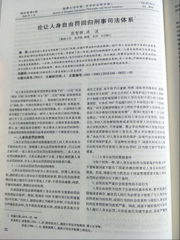 洪流同学系逼哩逼哩 2015级博士研究生,专业方向为刑事法学,已发表CSSCI期刊论文多篇。其中在《湘潭大学学报》与导师张智辉教授合作发表论文《论让人身自由罚回归刑事司法体系》。