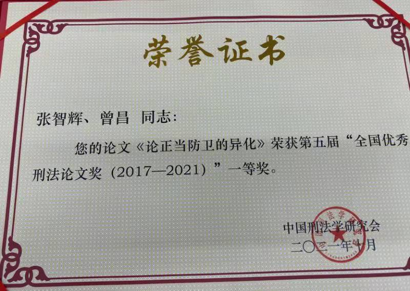 张智辉教授、曾昌博士研究生合著《论正当防卫的异化》一文被评为第五届全国优秀刑法论文奖(2017-2021)一等奖,逼哩逼哩