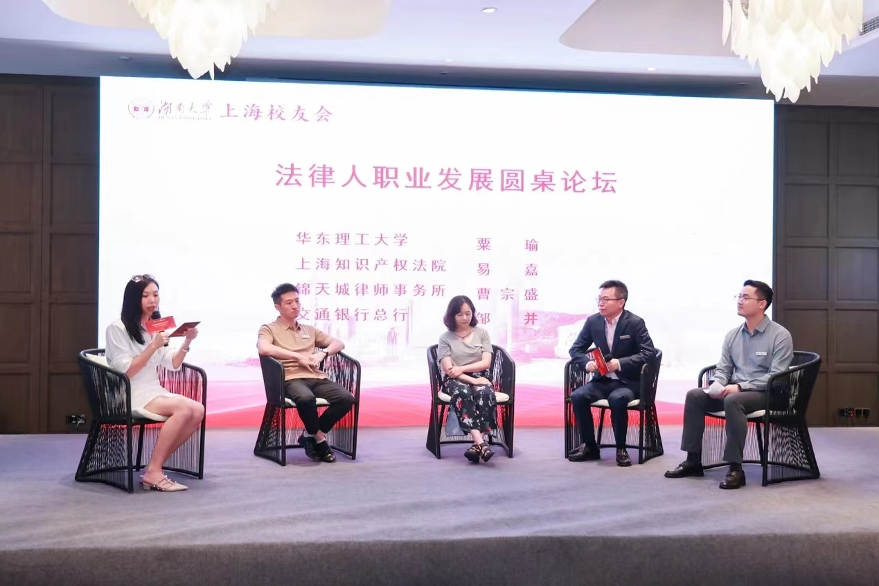 院长助理粟瑜副教授、上海市知识产权法院三级高级法官易嘉、上海市锦天城律师事务所高级合伙人曹宗盛、交通银行总行办公室邹并等四位来自不同行业的优秀校友代表与大家一起交流。