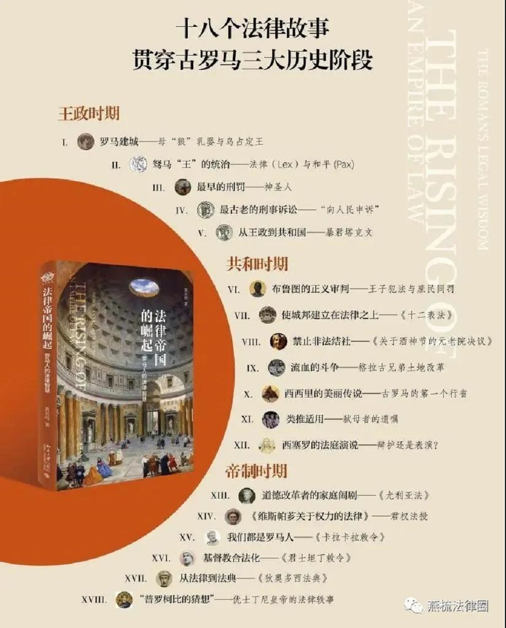 《法律帝国的崛起:罗马人的法律智慧》一书,以时间为线索讲述了许多体现罗马人法律智慧的重要事件,这非常有利于了解罗马法是如何在时间的长河中形成的。罗马法律帝国的崛起正如其历史一样,在若干个世纪的时间里经历了王政时期、共和时期和帝国时期。罗马法,正如您将会在这些非常有意思的故事里看到的那样,还经历了罗马持续的战争和内部冲突、疆域的扩张以及西部的衰落和东部的重生。这种重生既是法律的重生,也是拜占庭因优士丁尼皇帝的法典编纂活动所获得的重生。