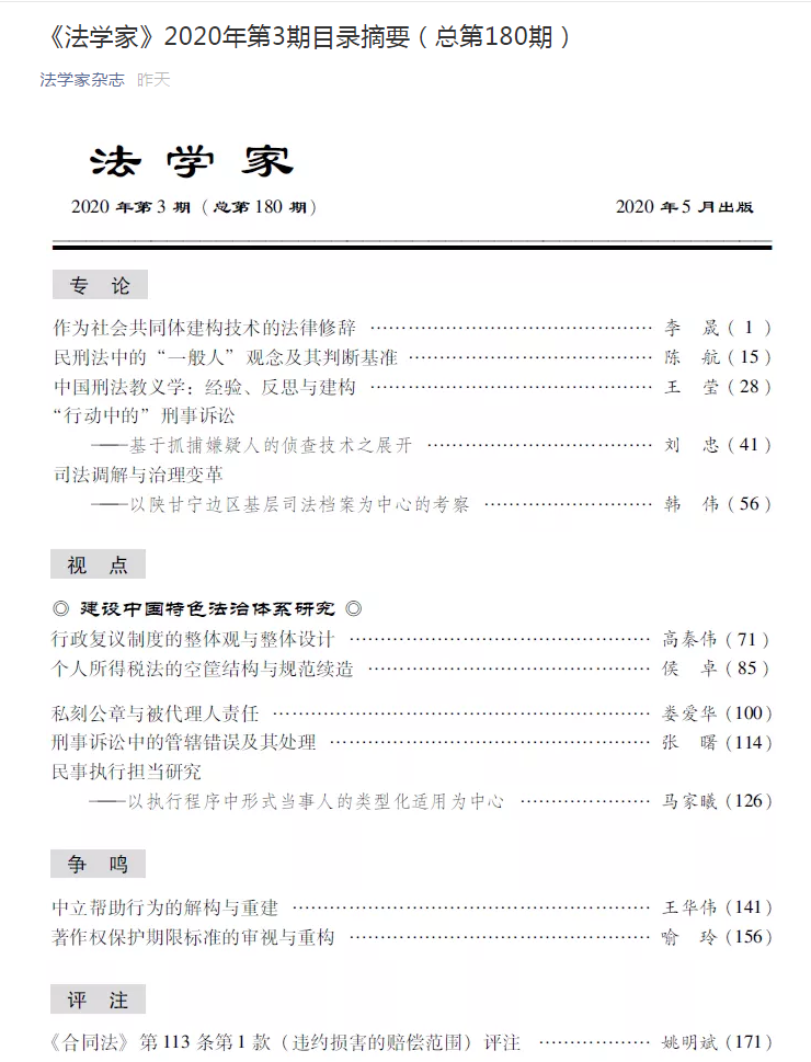教授李晟在《法学家》(法学核心期刊CLSCI)2020年第3期发表论文《作为社会共同体构建技术的法律修辞》。