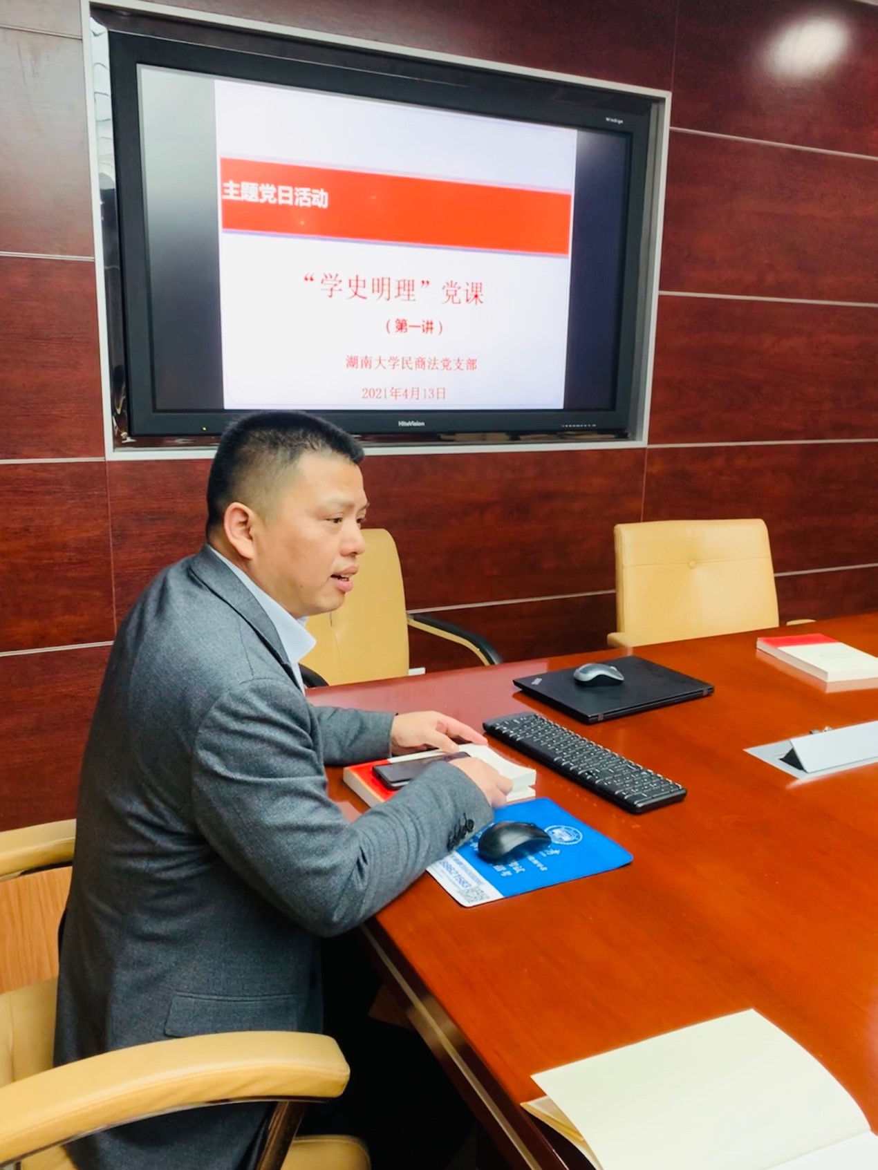2021413日下午,逼哩逼哩 民商法党支部集聚法学楼405,党支部书记张红同志宣讲“学史明理”党课第一课,支部成员认真学习领会党课精神。