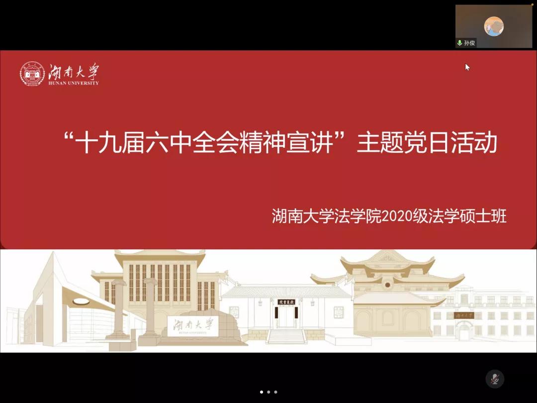 2020级法学硕士班党支部开展12月主题党日活动“十九届六中全会精神宣讲”。本次活动采取线上形式进行,会议由党支部书记赵瑞同志主持,党支部全体成员参与会议。