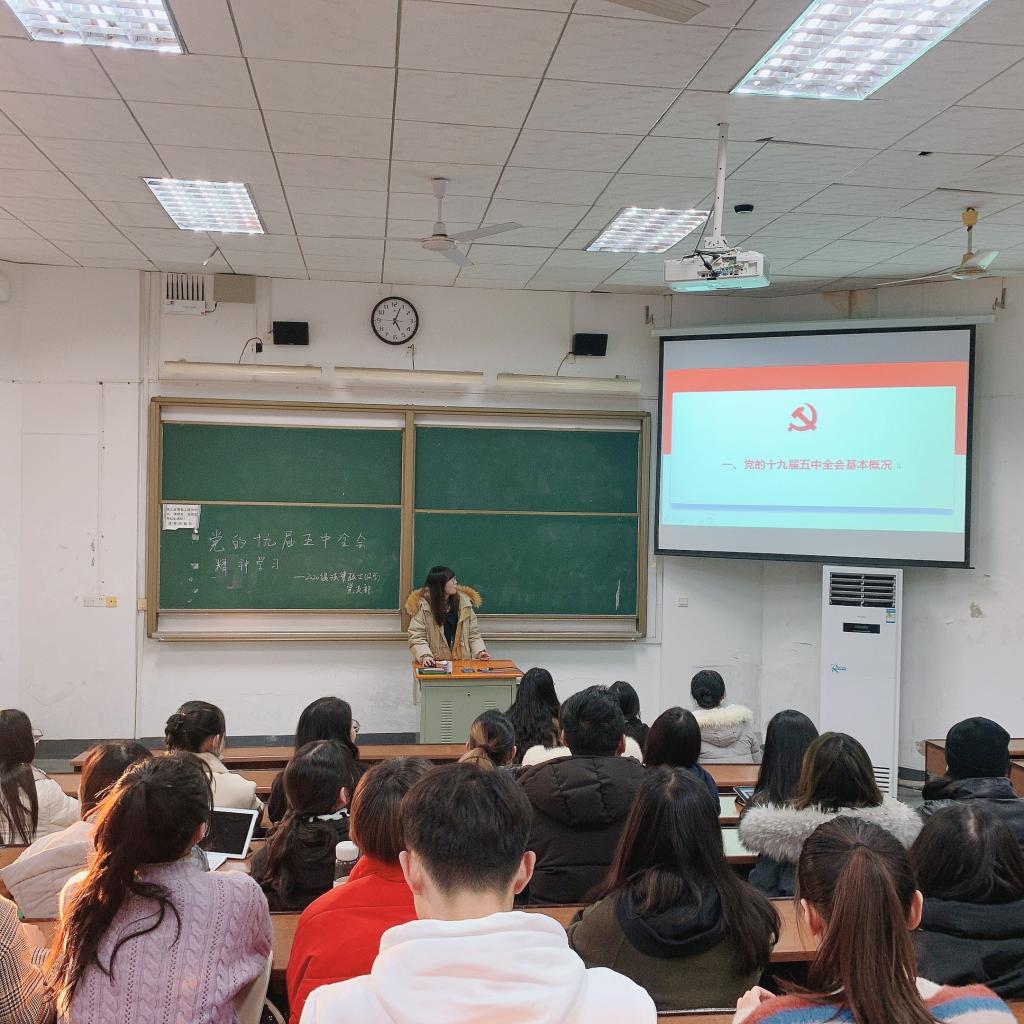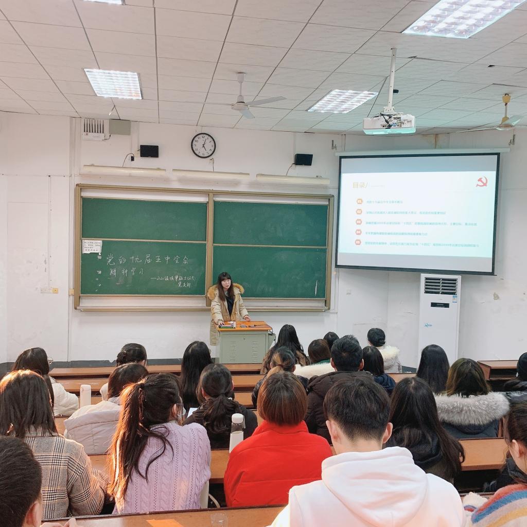 中国共产党第十九届中央委员会第五次全体会议,于2020年10月26日至29日在北京召开。会议审议了中共中央关于制定国民经济和社会发展第十四个五年规划和二〇三五年远景目标的建议,为实现社会主义现代化国家的新征程擘画蓝图。根据学校党委工作部署,为了深入学习贯彻党的十九届五中全会精神,自觉在思想上、政治上、行动上与党中央保持高度一致,2020级法律(法学)党支部于12月30日在北校梯教103开展学习活动。会议由支部书记丁怡丹同志主持。