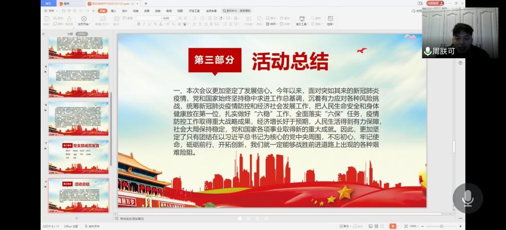 最后,周朕可同学总结到,通过这次十九届五中全会会议精神的学习,使得同志们更加坚定了沉着应对新冠肺炎疫情的挑战下发展的信心,更加明确了“十三五”取得成就的同时到来的“十四五”期间发展的目标,更加强化了新时代的党员干部为国家富强贡献自己力量的责任担当。