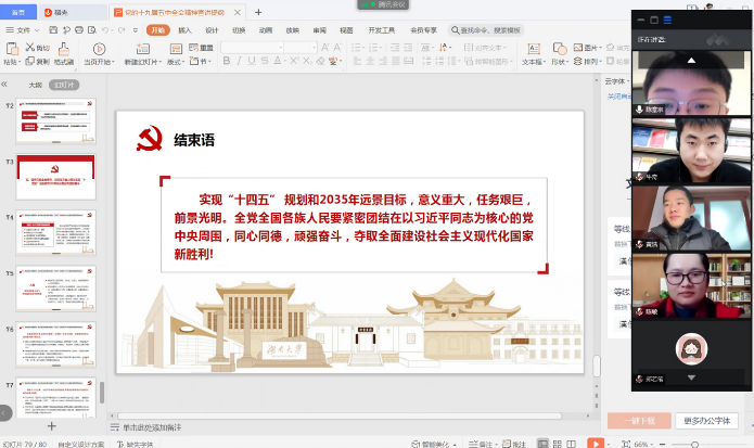陈章京同志播放ppt,并向大家介绍了十九届五中全会的详细内容。十九届五中全会审议通过《中共中央关于制定国民经济和社会发展第十四个五年规划和二〇三五年远景目标的建议》,明确提出“十四五”时期我国发展的指导方针、主要目标、重点任务、重大举措,集中回答新形势下实现什么样的发展、如何实现发展等重大问题,是今后5年乃至更长时期我国经济社会发展的行动指南。会议首提一系列战略性创新性举措,并强调民生改善和科技自立自强。同时,会议指出重要战略机遇期内涵发生变化。党的十六大就作出我国处于重要战略机遇期判断。近20年过去了,十九届五中全会作出全新重要判断,即当前和今后一个时期,我国发展仍然处于重要战略机遇期,但机遇和挑战都具有新的发展变化。