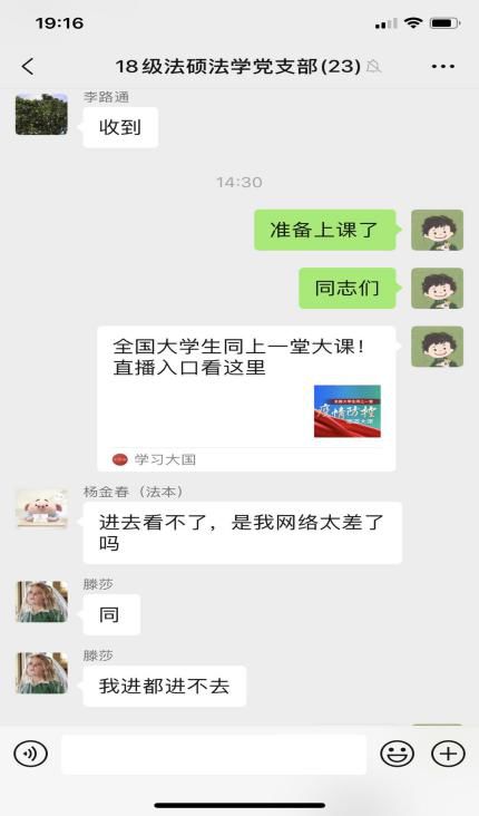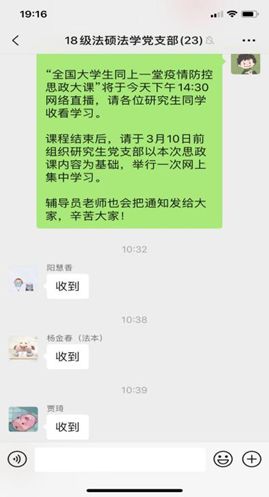 2017级法学党支部:“少年强则国强,少年立则国立”,这堂课,让我们明白了爱国的意义。正如冯秀军教授在课堂中对“岁月静好与小确幸”的生活方式表达了自己的看法,她认为责任与担当才能够创造美好生活。这不仅仅是一堂课,更是对我们人生的引领。身为一名大学生,我们要做的很多,即使不能奋斗在前线,我们依然要尽自己的一份微薄之力帮助祖国度过难关。我们用自己的方式去表达自己的关切,我们理智对待谣言,不传播不信服;我们居家不出,减少出行;我们用科学的理论武装头脑。我们始终相信,面对疫情最好的抵抗是众志成城,始终相信人定胜天。