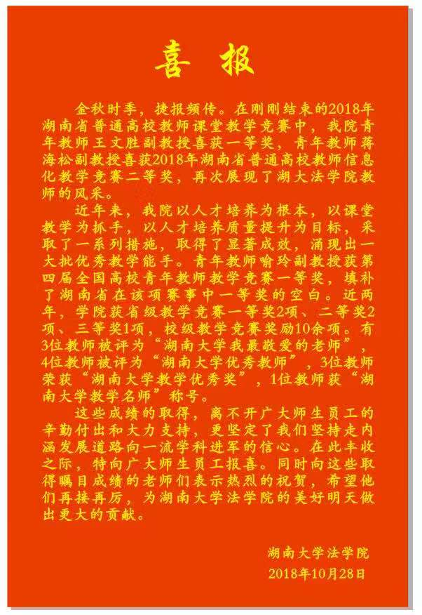 2018102628日,湖南省普通高校教师课堂教学竞赛决赛、湖南省普通高校信息化教学竞赛决赛举行,逼哩逼哩 教师再创佳绩。其中,逼哩逼哩 王文胜副教授以《民法学》获得湖南省普通高校教师课堂教学竞赛一等奖,蒋海松副教授以《法律与艺术》获得湖南省普通高校信息化教学竞赛二等奖,展现逼哩逼哩 教师的良好风采和逼哩逼哩 教学成果。