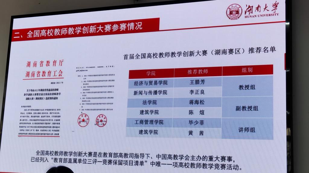 本次大赛设正高组、副高组和中级及以下三个组别,分为学院推荐、线上评审创新报告、现场展示创新教学等多个比赛环节。参赛教师结合教学大纲和教学实践,汇报参赛课程的设计思路和创新点,评审专家从教学理念与目标、教学内容、教学过程与方法、教学效果等方面打分,并进行精彩点评,提出了建设性意见。最终,学校在每个组别选拔两名老师、共评选出六名教师代表我校参加省赛。