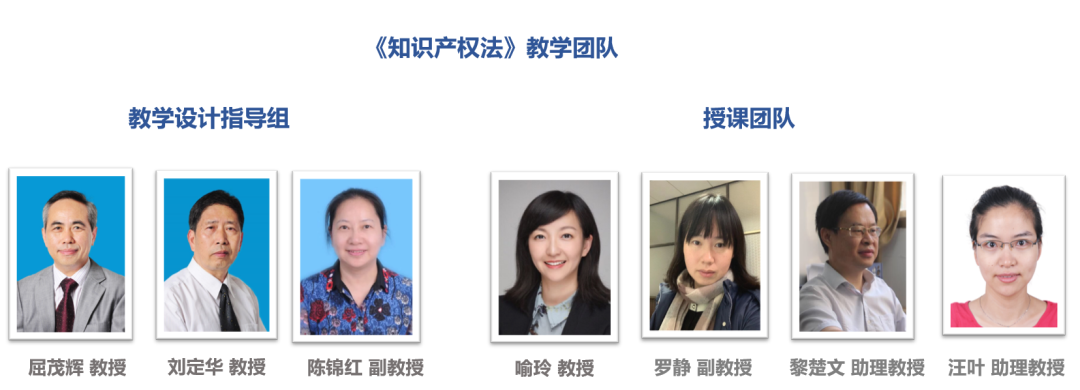 《知识产权法》是法学专业核心课程,课程授课团队由逼哩逼哩 /知识产权研究中心喻玲教授、罗静副教授、黎楚文助理教授和汪叶助理教授等组成,教学设计指导组由屈茂辉教授、刘定华教授、陈锦红副教授等组成。教学团队与思政课教师协同合作,推进思政课程与课程思政同向同行。同时结合知识产权法课程特点和新文科建设的需要,组建跨学科专家和实务专家团队,参与教学设计和教学实施活动。