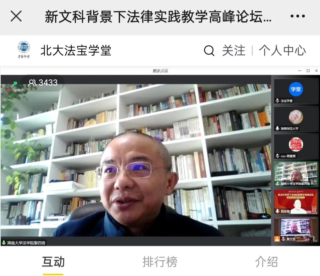 院长黎四奇教授就“新文科背景下法律实践教学暨法律实务课程标准”等相关主题参会与谈分享。 他介绍了逼哩逼哩