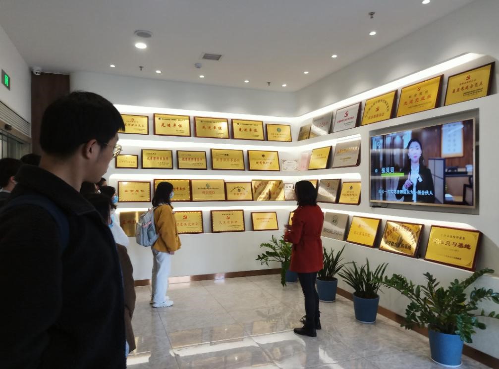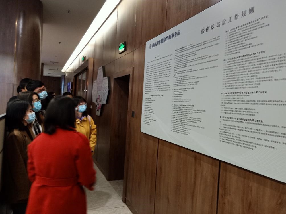 到达律所之后,市场总监陈彪首先带领大家参观了整个律所,对律所的管理、荣誉、党建等方面作出简单的介绍,也让同学们对湘军麓和律师事务所有了初步的认识。