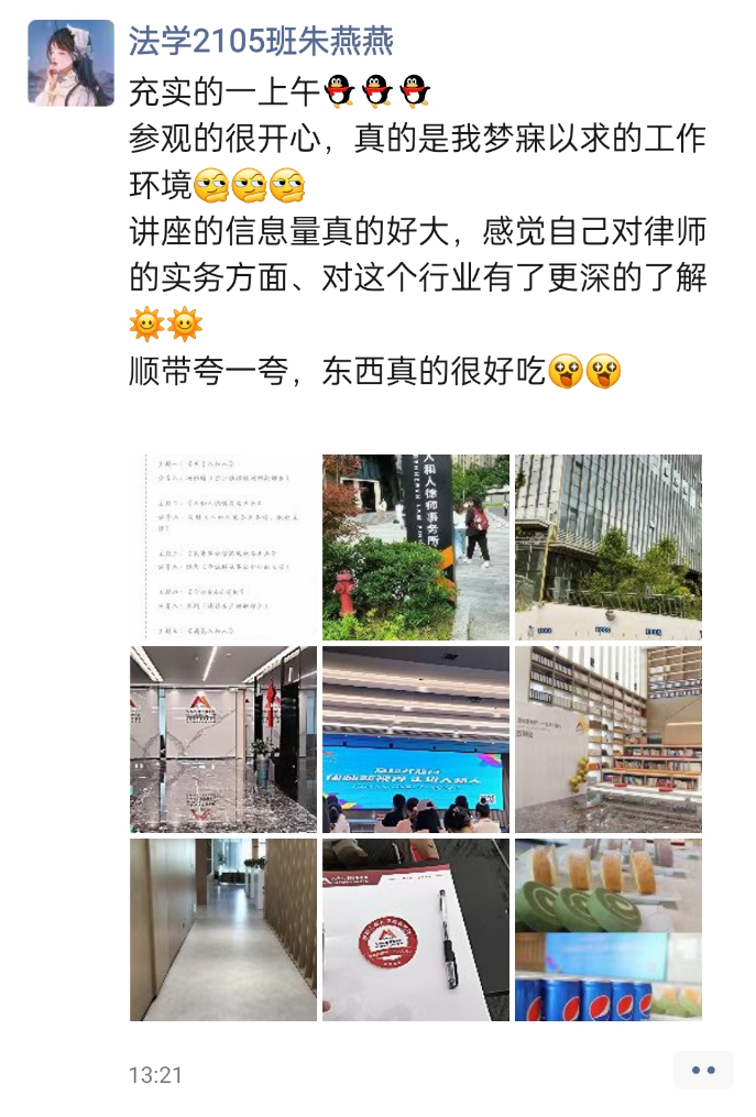 在一楼大厅签到后,同学们在律所工作人员的带领下,分批次参观了律师事务所的办公楼。同学们亲眼见到了律师的工作状态,对律师的办公环境有了更深刻的了解。在参观过程中,人和人律师事务所的工作人员给同学们讲解了各个工作区的用途,以及律所的逼哩逼哩和所获成就。专业性强、责任心重,这是人和人律师事务所带给同学们最大的感受。