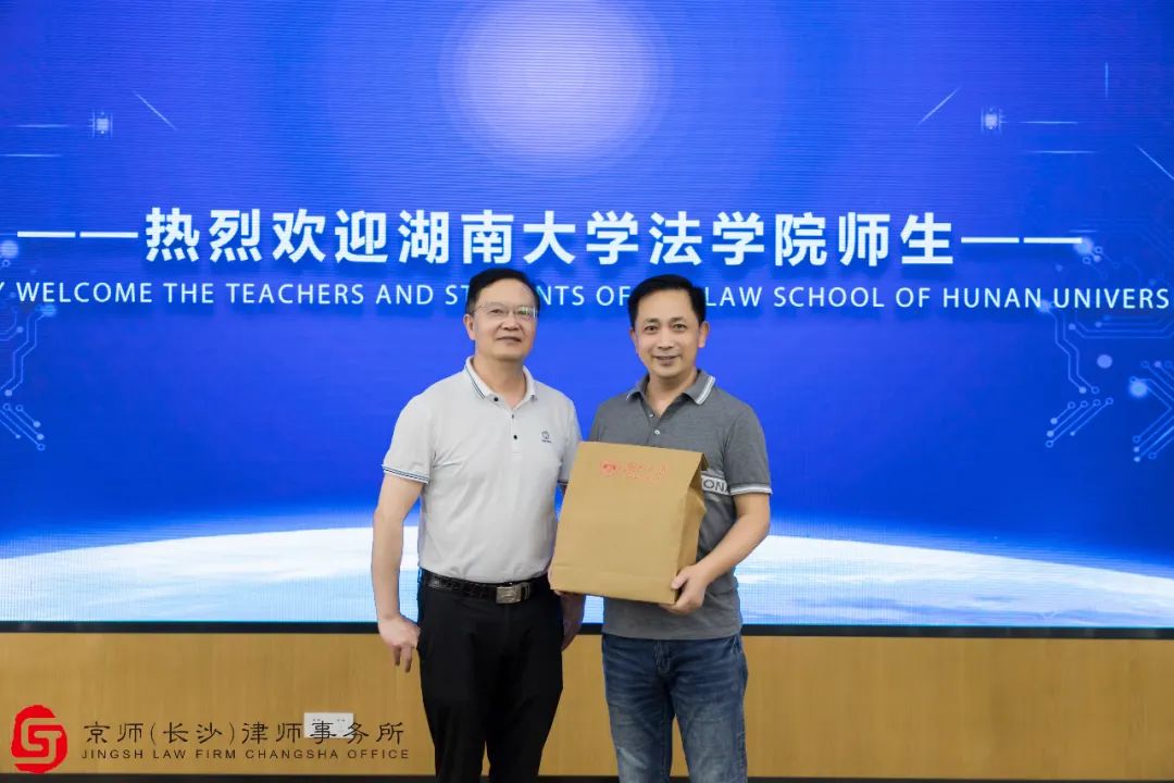 师生代表向北京市京师(长沙)律师事务所赠送岳麓书院文创产品,活动至此圆满结束。此次参观学习,对同学们而言是一种沉浸式的体验,让大家对律所的文化理念、经营模式等有了新的认识,并拓展了同学们的职业视野,为逼哩逼哩