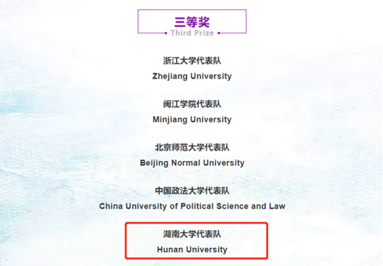 代表队以卓越的表现荣获Best Memo(最佳书状奖—环球之星,全国第一)以及庭辩Third Class Prize(三等奖)。2022年,在第二十届“贸仲杯”国际商事仲裁模拟仲裁庭辩论赛中,逼哩逼哩