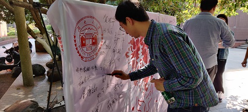 东方红广场一侧举行,几位同学通过情景剧的形式,真实地还原艾滋病患者被歧视的情形。同时街头宣传者对患病者的保护和对艾滋病相关知识的讲述也取得良好的效果。班级同学的演讲更将“青春不染”的活动主题有力地通过具体的事例和生动的阐释传达出来。随着活动进程的不断推进,越来越多的同学和游客被吸引,逐渐聚拢在活动现场,大家有序地在签名板上写下自己的名字和温暖的话语,以此表达自己对艾滋病人和结核病人的支持。同学们还将精心制作的传单分发给路人们,整个活动循序渐进,形式新颖多样,引起热烈反响。