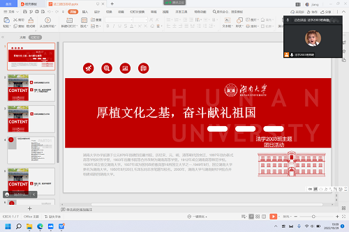 为弘扬伟大的爱国主义精神, 开展爱国主义教育,增进各成员对中国优秀历史文化的了解,坚定各成员的理想信念,2022年10月29日,法学2003班团支部根据工作部署开展了关于“学习贯彻《论党的青年工作》重要精神”主题团日活动,本次活动由团支书蒋婕主持,法学2003班全体同学参与。
