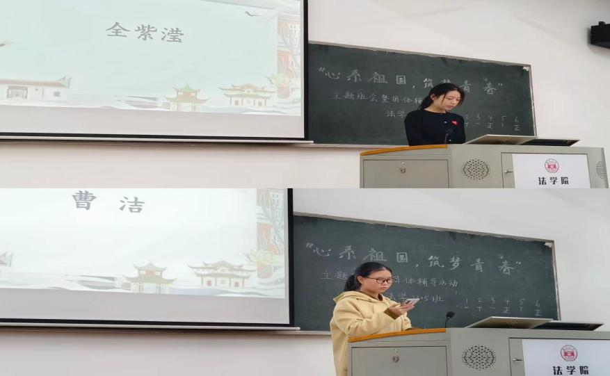 (法学2302班班长左岸曈和团支书温静怡主持班会)