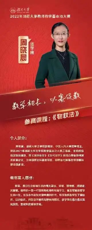 周晓晨老师通过学校督导随堂听课、教学设计等环节的层层选拔,从全校众多参赛选手中脱颖而出,获得参加文科组决赛的资格。决赛中,周晓晨老师以法学专业核心课程《物权法》参赛,选取建筑物区分所有权中的“住改商”问题进行讲解。周老师通过身边的生活事例引入主题,结合司法案例和法学基本原理,对《民法典》第279条进行了生动有趣的讲解。短短10分钟的现场授课,周老师亲切自如、深入浅出的讲课风格给现场评委和观众留下了深刻印象。最终,周晓晨老师荣获2022年逼哩逼哩
