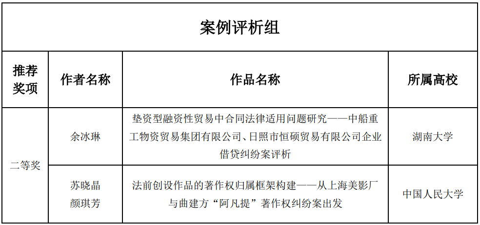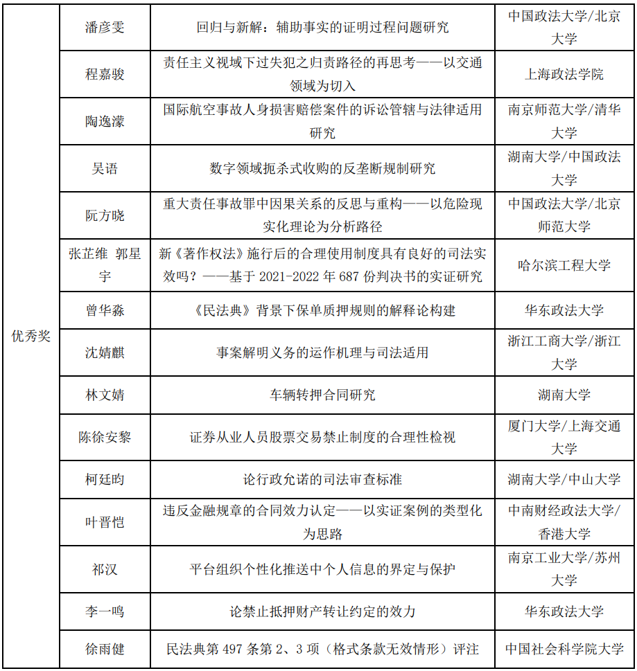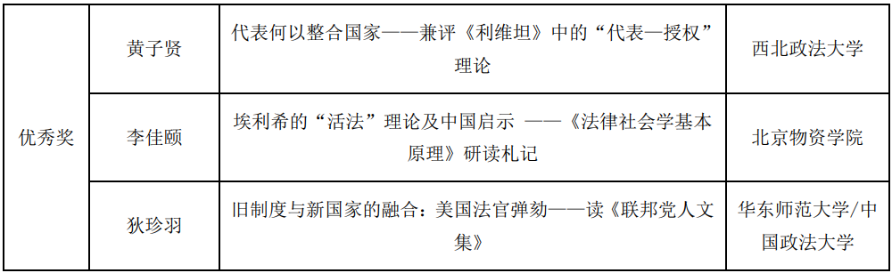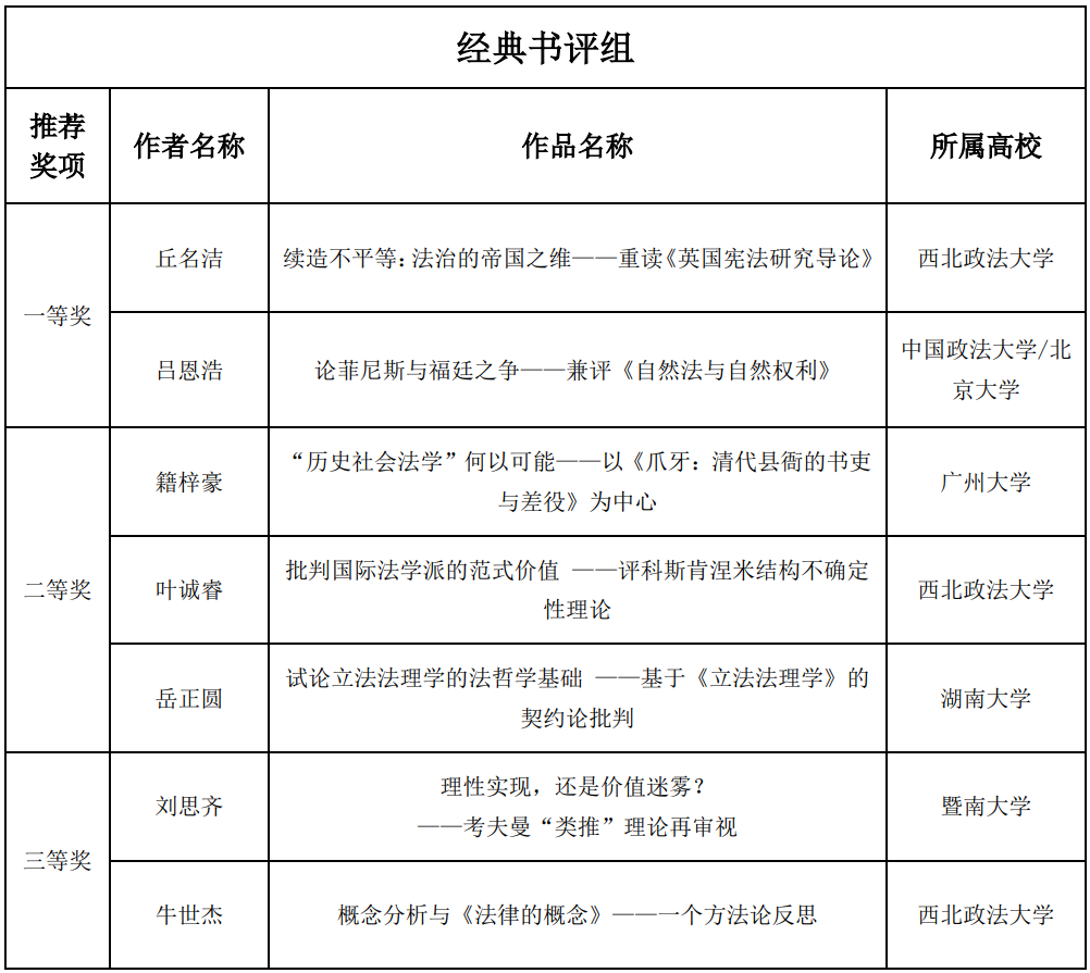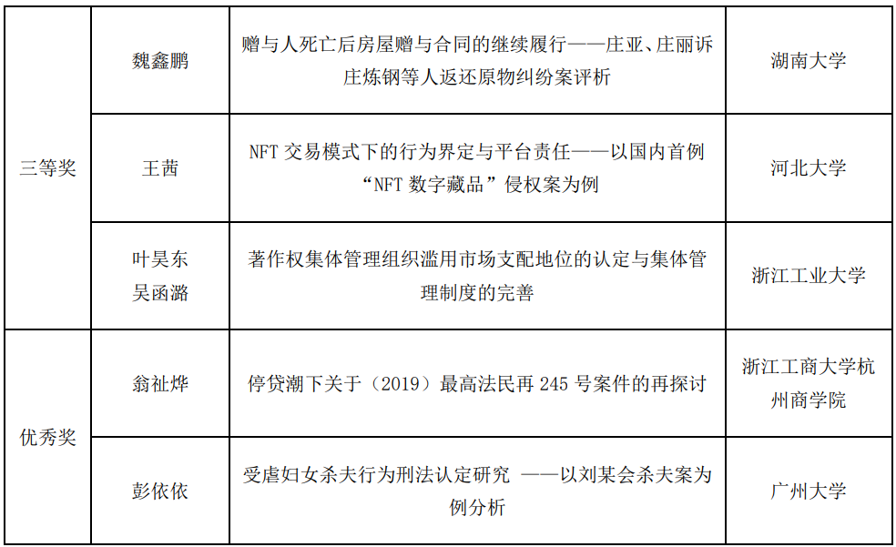 秉承“强化法科学生写作训练,提升法科学生写作水平,奖励法科学生优秀作品”的办赛宗旨,经过初赛匿名评审、参赛资格复审、复赛专家评分、专家组讨论拟定获奖建议名单、大赛组委会审定及拟获奖名单公示,本届大赛最终确定一等奖3名、二等奖7名,三等奖15名、优秀奖20名、优秀指导奖2名,优秀组织奖2名。现将获奖名单公布如下: