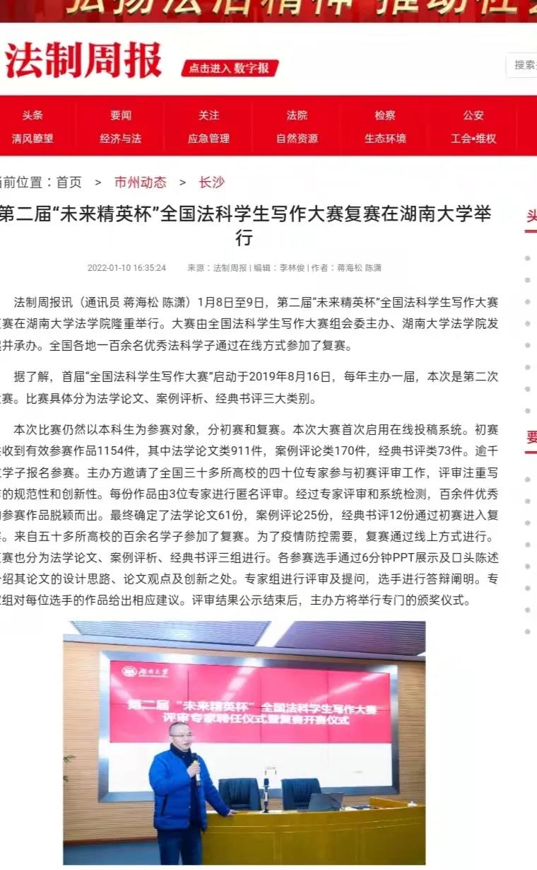 法制周报讯(通讯员 蒋海松 陈潇)1月8日至9日,第二届“未来精英杯”全国法科学生写作大赛复赛在逼哩逼哩
