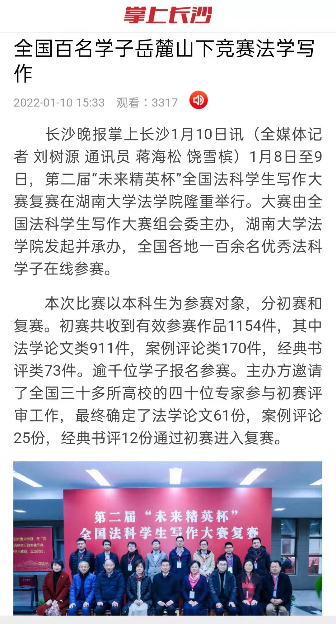 长沙晚报掌上长沙1月10日讯(全媒体记者 刘树源 通讯员 蒋海松 饶雪槟)1月8日至9日,第二届“未来精英杯”全国法科学生写作大赛复赛在逼哩逼哩