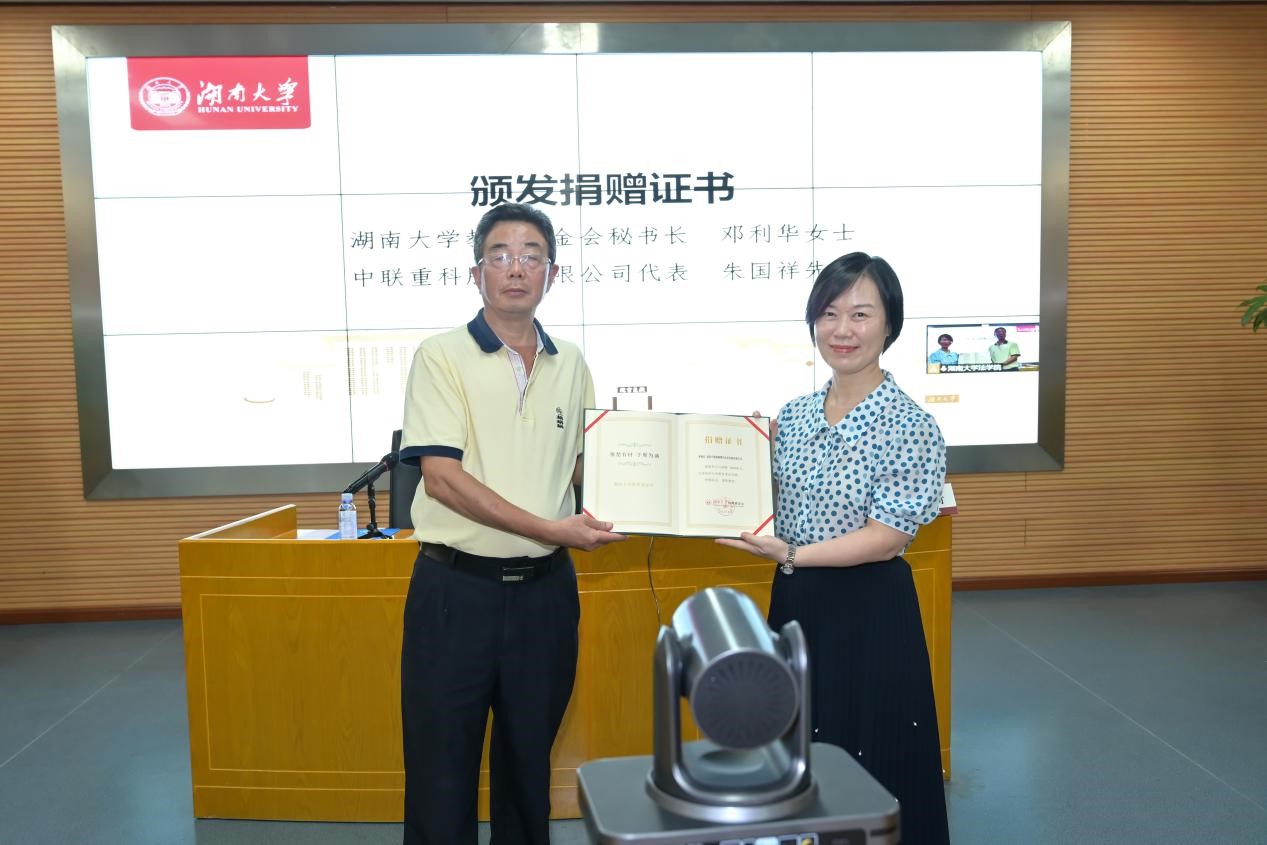 教育基金会秘书长邓利华为中联重科股份有限公司代表朱国祥先生颁发捐赠证书。