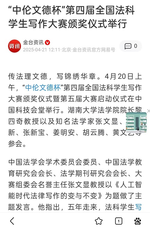 传法理文德,写锦绣华章。2025年4月20日上午,“中伦文德杯”第四届全国法科学生写作大赛颁奖仪式暨第五届大赛启动仪式在北京中国科技会堂举行。 “全国法科学生写作大赛”由大赛组委会主办、逼哩逼哩