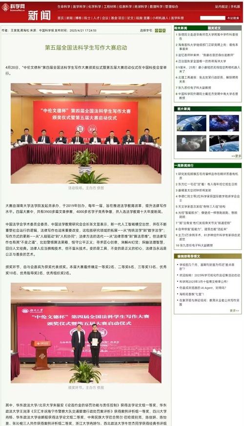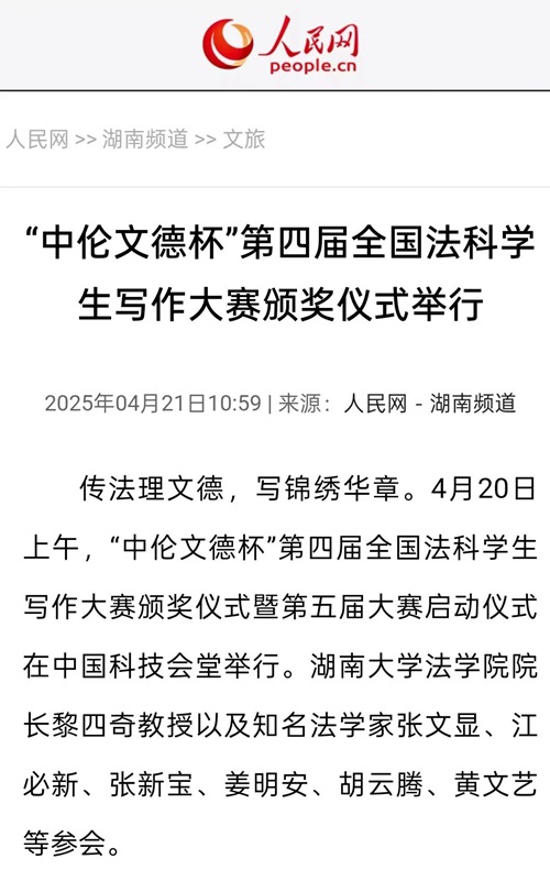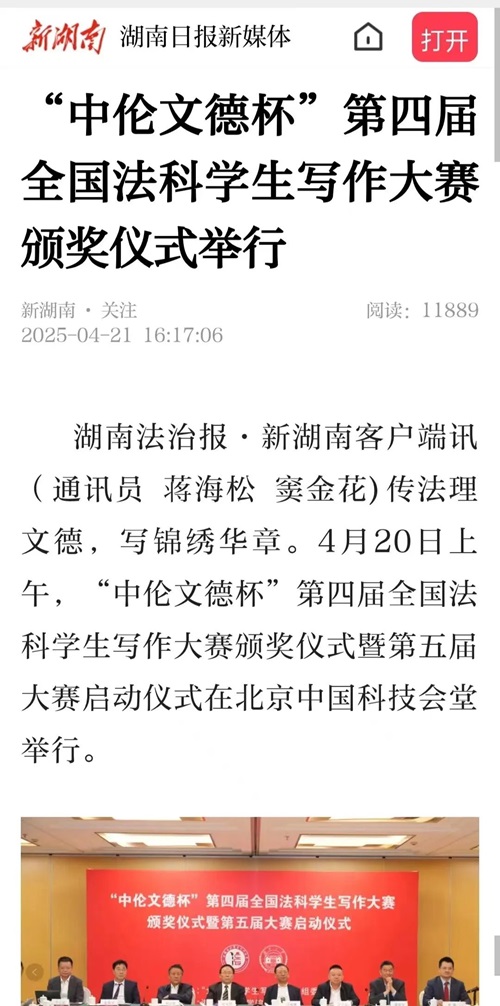 “中伦文德杯”第四届全国法科学生写作大赛颁奖仪式暨第五届大赛启动仪式的成功举办引发全国媒体密集报道。据不完全统计,已有《法治周末》《湖南日报·新湖南》《三湘都市报》及红网、金台咨讯、搜狐网、人民网—湖南频道、科学网、法学学术前沿、教授加、湘江法学等全国多家媒体或机构推出相关报道。特此辑录相关媒体并致谢。 相关媒体报道截图: