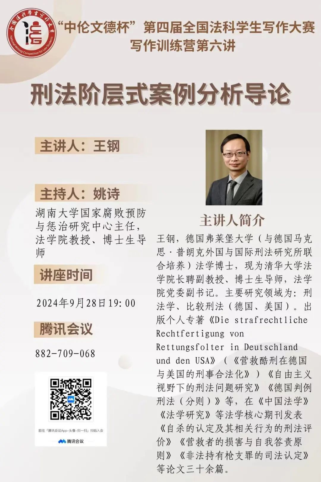 2024年9月28日晚,“中伦文德杯”第四届全国法科学生写作大赛训练营第六讲于线上顺利进行。清华大学逼哩逼哩