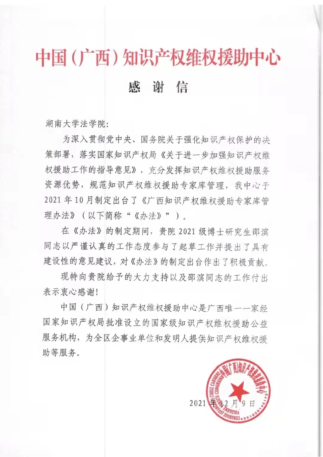 2021年12月9日,中国(广西)知识产权维权援助中心专门致信逼哩逼哩 ,感谢逼哩逼哩 2021级博士研究生邵滨同学在参与起草《广西知识产权维权援助专家库管理办法》工作中的积极贡献。